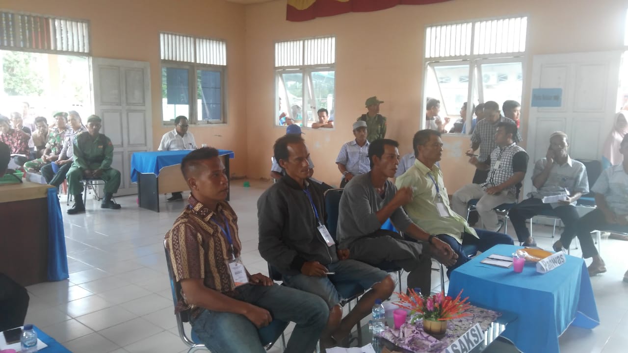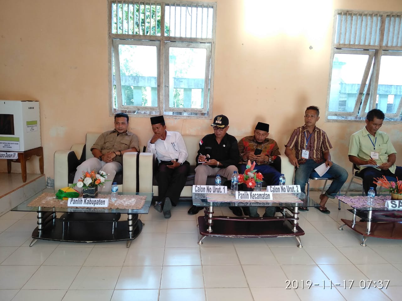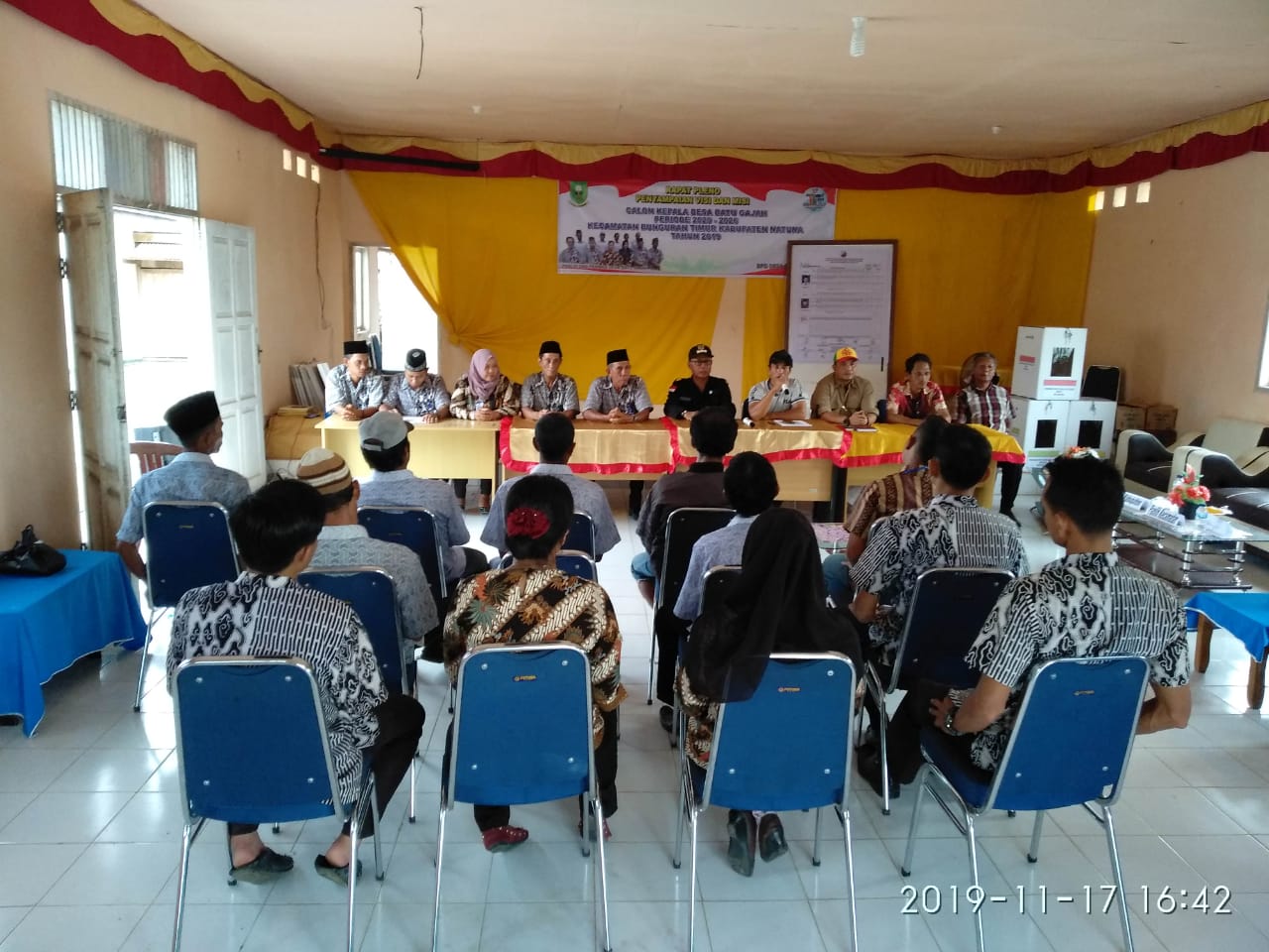 Dua Calon Kepala Desa Batu Gajah, duduk berdampingan, ditengahi oleh Camat Bunguran Timur dan didampingi oleh Tim Pemantau dari Kabupaten
