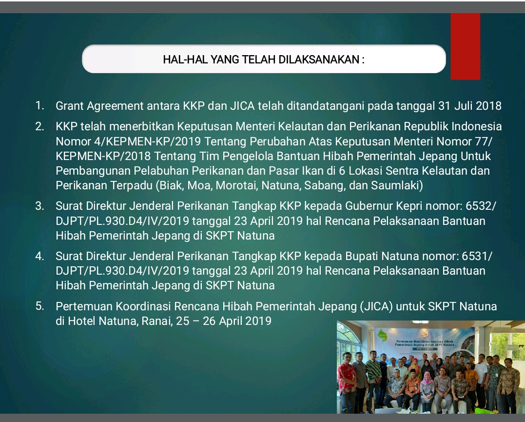 “Yang sudah dikerjakan antara lain : Grand Agreement antara KKP dan JICA telah ditandatangani pada tanggal 31 Juli 2018. Selanjtunya KKP telah menerbitkan Keputusan Menteri KKP RI No. 4/KEPMEN-KP/2019 tentang perubahan atau Keputusan Menteri No. 77/KEPMEN-KP/2018 tentang Tim Pengelola Bantuan Hibah Pemerintah Jepang untuk Pembangunan Pelabuhan Perikanan dan Pasar Ikan di 6 Lokasi Sentra Kelautan dan Perikanan Terpadu yaitu, Biak, Moa, Morotai, Natuna, Sabang dan Saumlaki” Tambah Kasubdit Kelembaggan dan Perlindungan Nelayan itu.